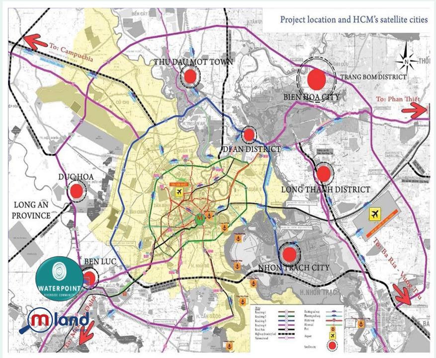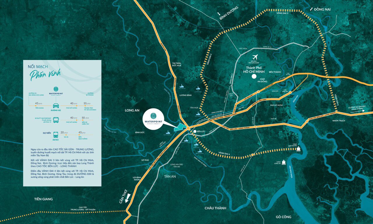 Thứ nhất, Waterpoint nằm ở cửa ngỏ của hai vùng động lực kinh tế, bao gồm vùng động lực kinh tế TP.HCM và vùng động lực kinh tế Đồng bằng sông Cửu Long (Mekong Delta). Với vị trí nằm ở giữa như vậy, mọi người muốn đi về TP.HCM, muốn đi về Mekong Delta đều phải đi qua dự án.