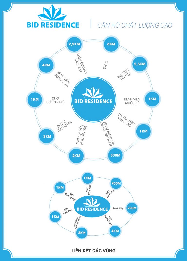 Dự án BID Residence nằm ngay đầu cửa ngõ của địa phận Thủ đô, kết nối trực tiếp với các tuyến giao thông huyết mạch như: tuyến bus BRT, đường Lê Trọng Tấn, Lê Văn Lương , Vành đai 3, đường sắt trên cao Cát Linh – Hà Đông,…di chuyển vào trung tâm Hà Nội chỉ mất 5 phút lái xe. Được coi là một trong những vị trí vàng cuối cùng tại Thủ đô